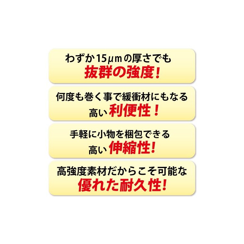 • Features: It boasts outstanding strength even with a thickness of only 15 microns. It can also be used as a cushioning bag by wrapping it over and over. High elasticity for easy packing small items. The high strength film material makes it highly durable