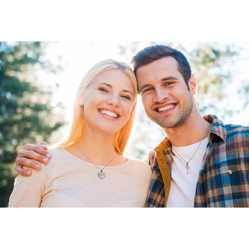- Zwei Partnerketten mit Anhängern im ausgefallenen Design dank individueller Wunschgravur eine tolle und persönliche Geschenkidee. Der Lieferumfang enthält: 2 Gravierte Anhänger, 2 Ketten, 2 Schmuckbeutel