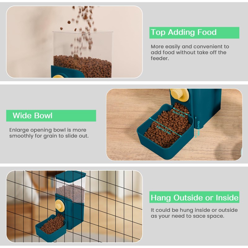 - [Suggest Tips] The size of pet feeder is 8.7x3.9x8.7". Please check your cage spacing before purchasing, the cage wire is recommended to be spaced between 3-6cm(1.2-2.4"). By the way, please do not wash the dispenser in hot water.