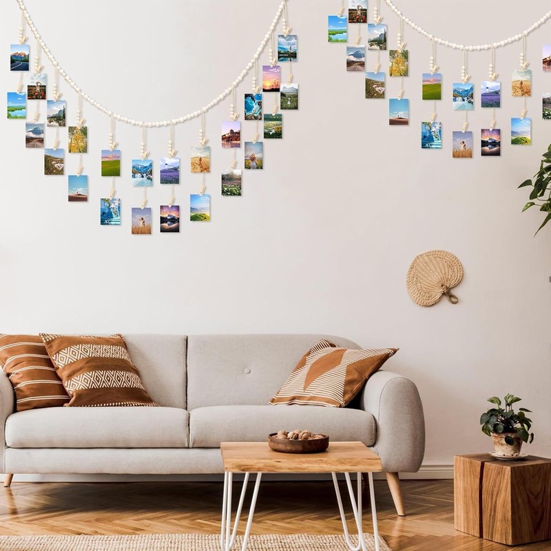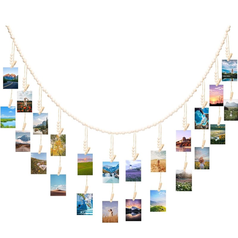 - Stylish Design: Our Hanging Photo Display with Clips features a charming 70" wooden bead garland, 24 Wood Clips, providing a trendy and bohemian touch to any space; Perfect for showcasing your cherished moments while enhancing your room decor