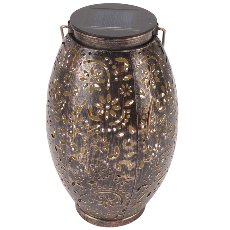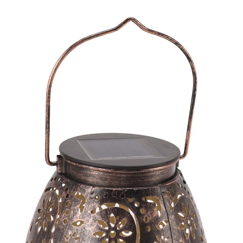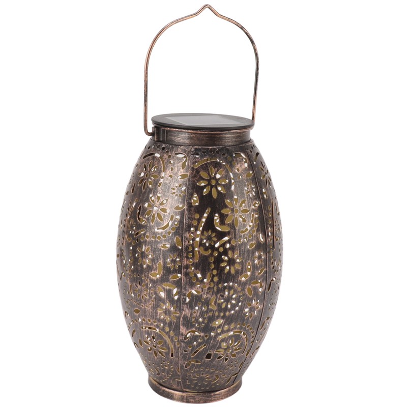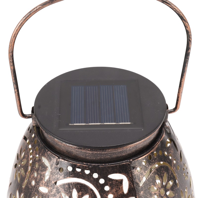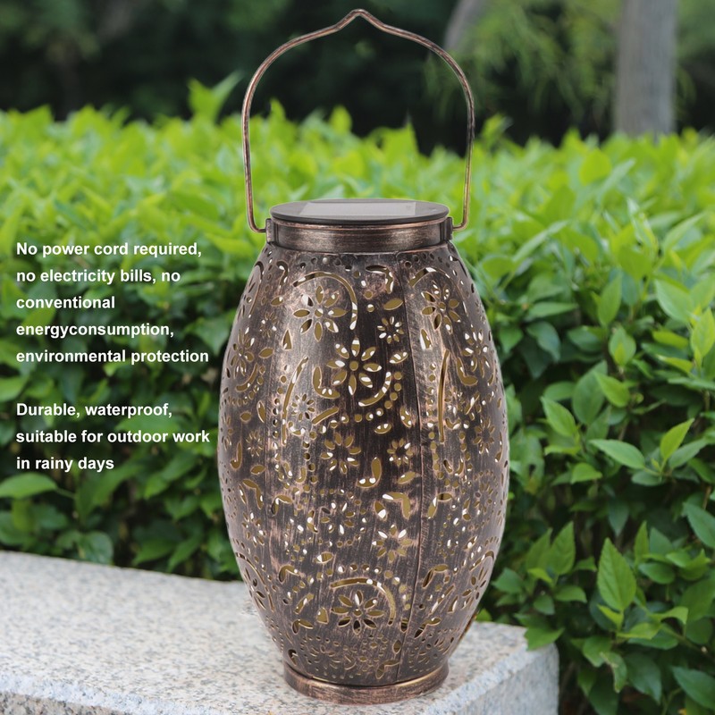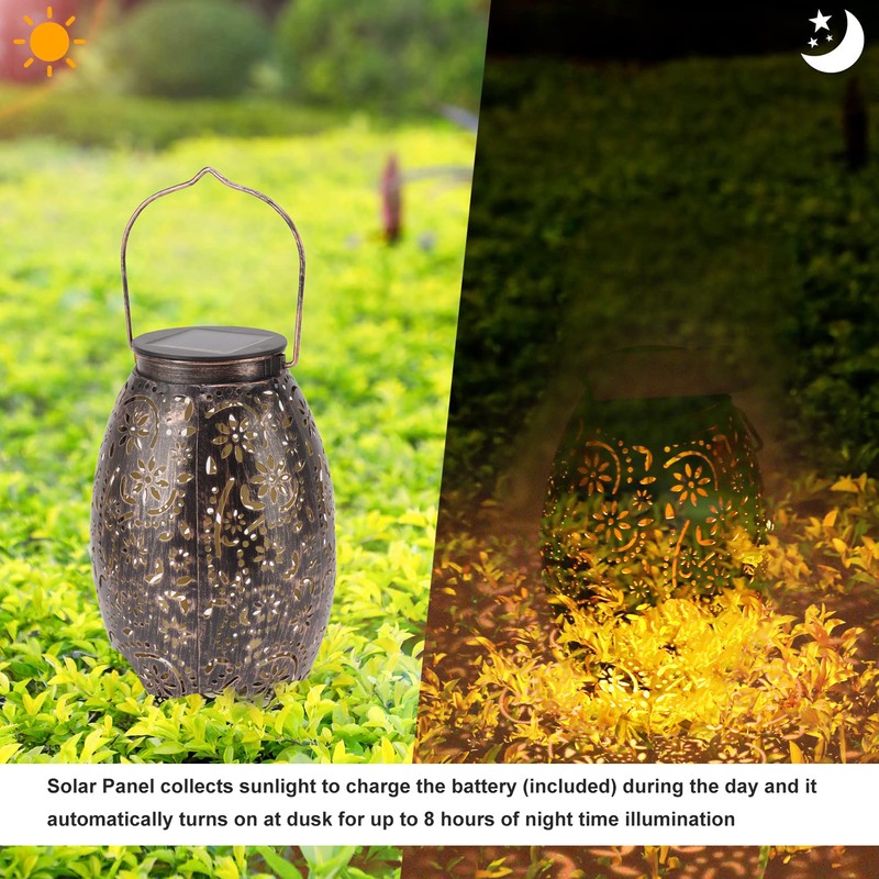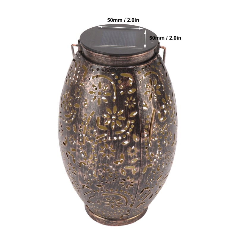 1、Reliable Perforamnce: Hollow out chrysanthemum pattern solar lantern does not require power cords, no electricity bills, no conventional energy consumption. It is environmental, corrosion proof, waterproof, and can work outdoors in rainy days. 2、Creating An Ambiance: The hanging metal solar lantern can add ambiance to your garden, outdoor, dinning table or patio. The delicate reflection of the leaves after lighting gives you unexpected visual effects. 3、Solar Powered: Polycrystalline silicon solar panel collects sunlight to charge the battery (included) during the day and it automatically turns on at dusk for up to 8 hours of night time illumination. 4、Applicable Scene: Hollowed out chrysanthemum shadow lantern can be hung anywhere you want. Lantern is very suitable as a decorative light for trees, yards, pavilions, backyards, decks, parties, etc. 5、Good Workmanship: Retro garden solar lamp, with exquisite workmanship and beautiful appearance, provides you great using experience.