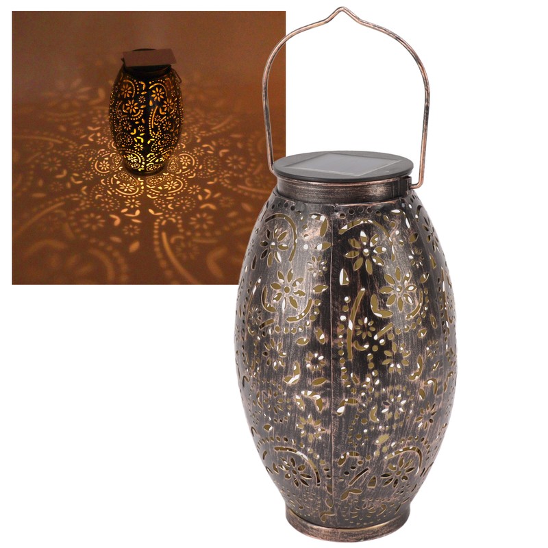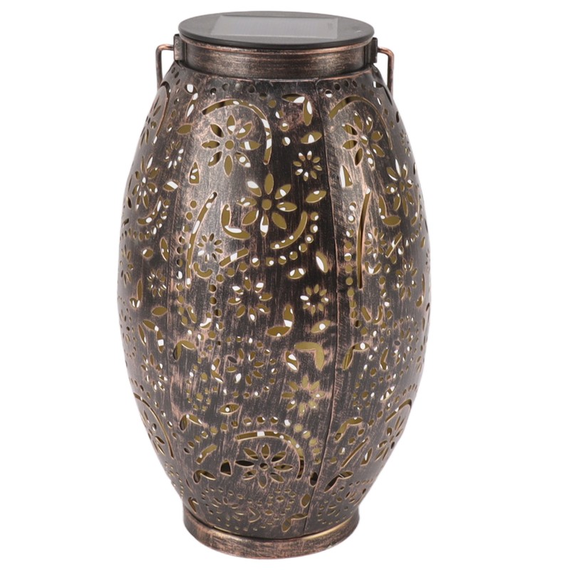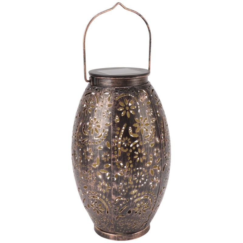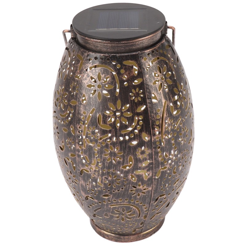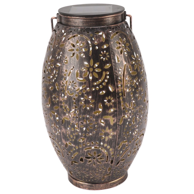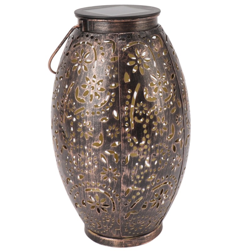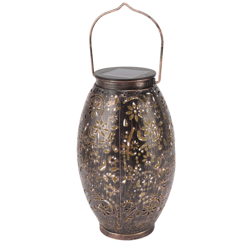 1、Reliable Perforamnce: Hollow out chrysanthemum pattern solar lantern does not require power cords, no electricity bills, no conventional energy consumption. It is environmental, corrosion proof, waterproof, and can work outdoors in rainy days. 2、Creating An Ambiance: The hanging metal solar lantern can add ambiance to your garden, outdoor, dinning table or patio. The delicate reflection of the leaves after lighting gives you unexpected visual effects. 3、Solar Powered: Polycrystalline silicon solar panel collects sunlight to charge the battery (included) during the day and it automatically turns on at dusk for up to 8 hours of night time illumination. 4、Applicable Scene: Hollowed out chrysanthemum shadow lantern can be hung anywhere you want. Lantern is very suitable as a decorative light for trees, yards, pavilions, backyards, decks, parties, etc. 5、Good Workmanship: Retro garden solar lamp, with exquisite workmanship and beautiful appearance, provides you great using experience.