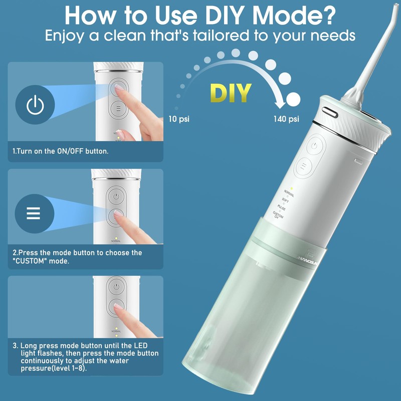 - Perfect Pressure, Perfectly Tailored: Beyond the core 3 modes, discover a customisable DIY setting. Fine-tune your experience across 8 distinct pressure levels, allowing you to craft a perfectly comfortable and effective routine, ensuring optimal results for both sensitive gums and thorough cleaning.