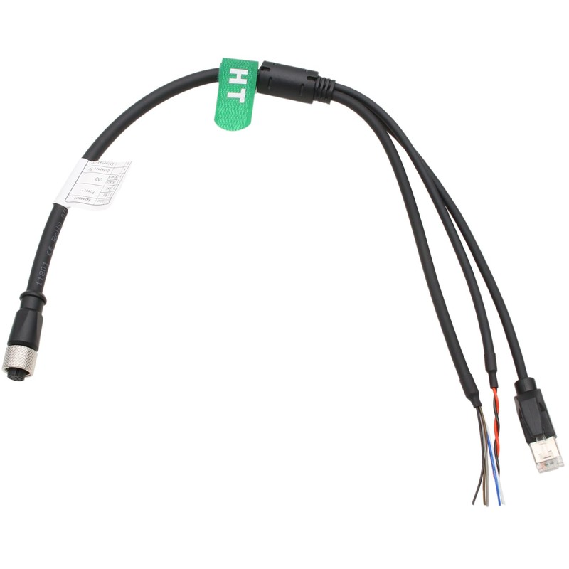 - M12 12-pin A-code female connector to RJ45 Ethernet network cable, 2-wire power cable, 5-wire function cable. Gold-plated contacts, nickel plated brass shell, waterproof, solid and durable connection
