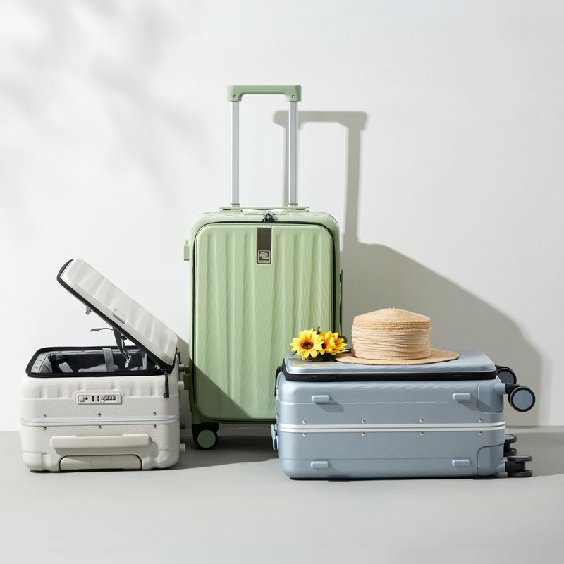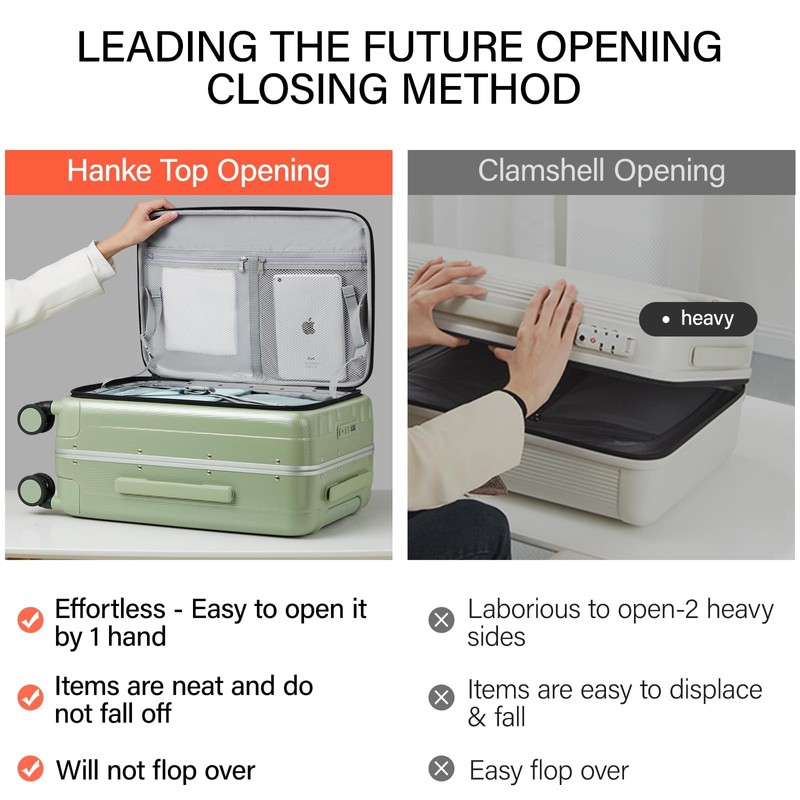 • 【Innovative design】It's a carry on luggage with Upright Front pocket design,You can quickly access to electronic products,easy to deal with office and security check,separate storage from clothes,to keep belongings organized.(Not clamshell opening method,the middle aluminum frame is reinforced design and cannot be opened.)
