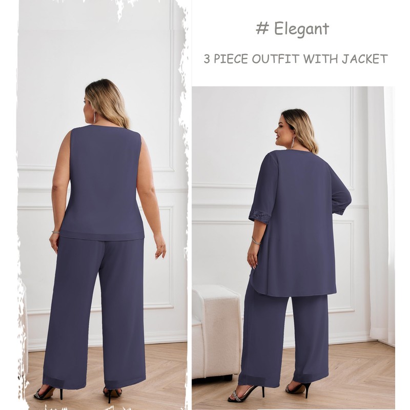 - Plus Size 3 Piece Pant Suits: Elegant mother of the bride pants suit features in sequined neck, wide leg pants with pockets and 3/4 sleeve chiffon long cardigan hiding the imperfection yet still flowy and beautiful.