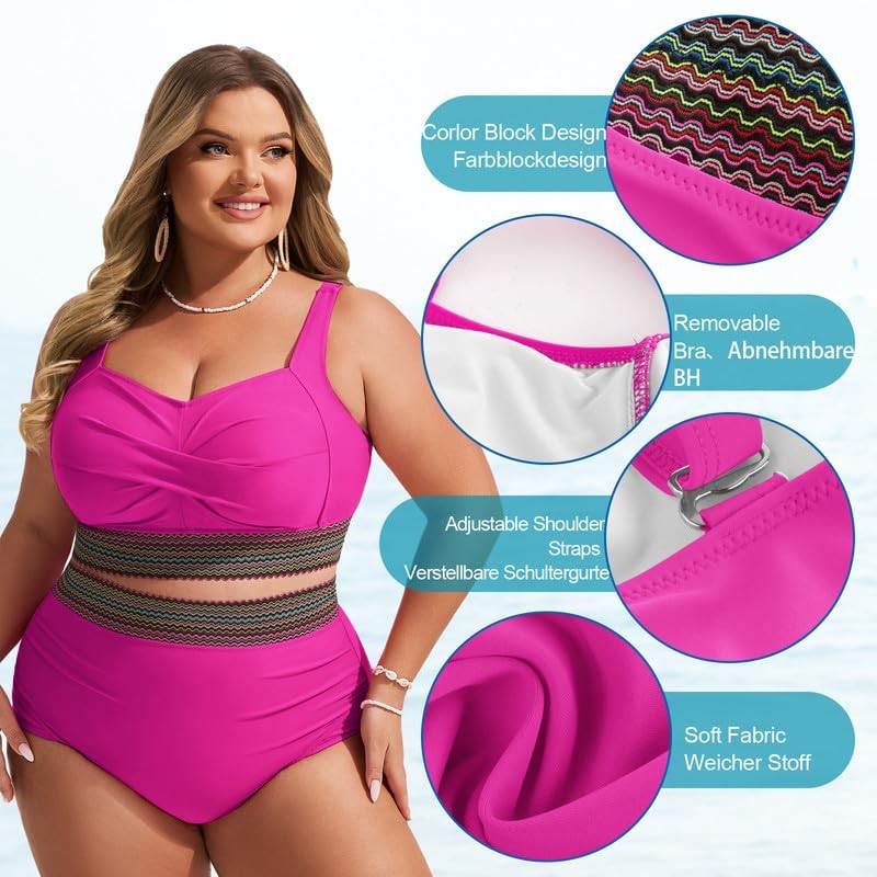 - Innovative large size colour block bikini set: experience fashion and functionality with our plus size bikini swimsuits, made of fabrics that are stretchy, skin-friendly, breathable and opaque. These durable materials ensure a long lasting fit for all body types. The playful, twisted, cut out colour blocks retain their vibrant colour and shape even after washing.