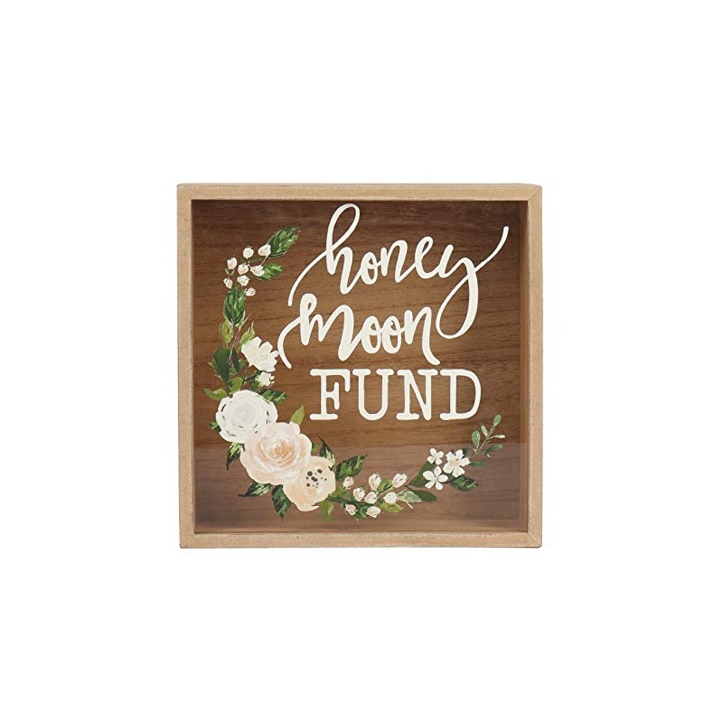 - DESIGN: Rustic Wood box with Mixed Floral Garland design, “Honey Moon Fund” print in white, and wide slit on the top of the box.