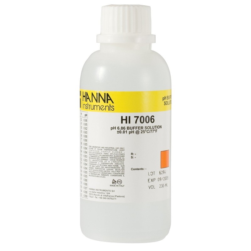 - Standard type / Specifications / Product Name: pH Standard Liquid 6.86 / Model Number: HI7006M / Manufacturer: Hanna Instruments / @ 25°C: ±0.01pH / Capacity: 7.1 fl oz (230 ml) bottle / *Actual size may vary slightly from the listed capacity