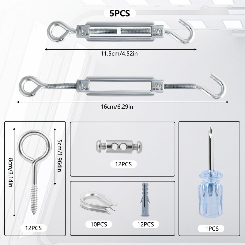 - Professional Turnbuckles for Cables Wire Kit: Includes a 100 ft steel cable wire, 5 M5 cable turnbuckle wire tensioners, 10 wire rope thimbles, 12 3-inch eye screws, 12 cable clips, 1 cable clamp screwdriver, and 12 expansion tubes for concrete walls