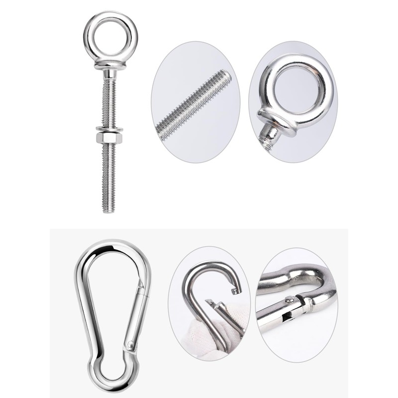 - Packag: 5pc 316 stainless steel eye bolt kit with nuts and washers. The nuts providing firm hold, The washers can prevent loosening, Also comes with 5pcs spring snap hooks of 316 stainless steel suitable for a variety of binding, rigging and anchoring hardware.
