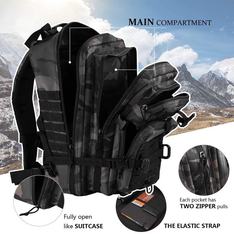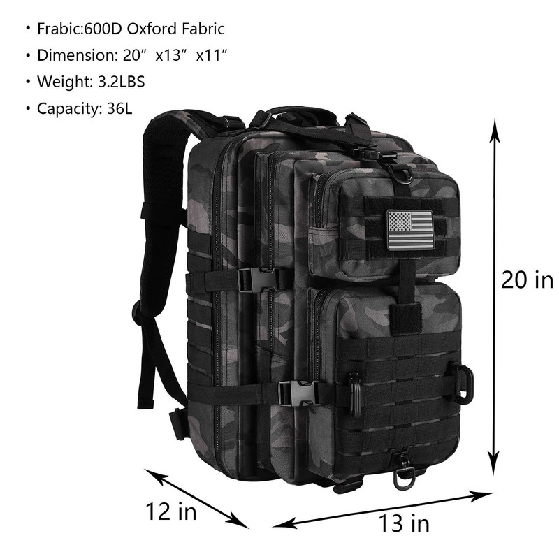 - LARGE CAPACITY - Military tactical backpack size approx.:12"*20"*13" / 30*50*33CM (W*H*D) This 36L tactical military assault backpack is made of durable and water-resistant 600x600 Density fabric, works great with 3L hydration bladder