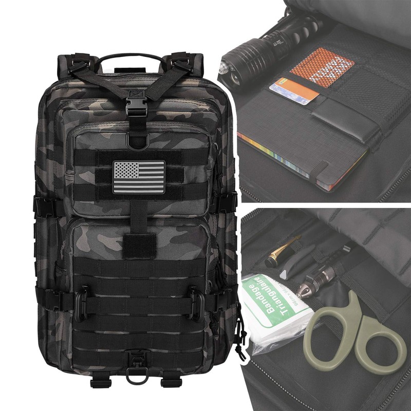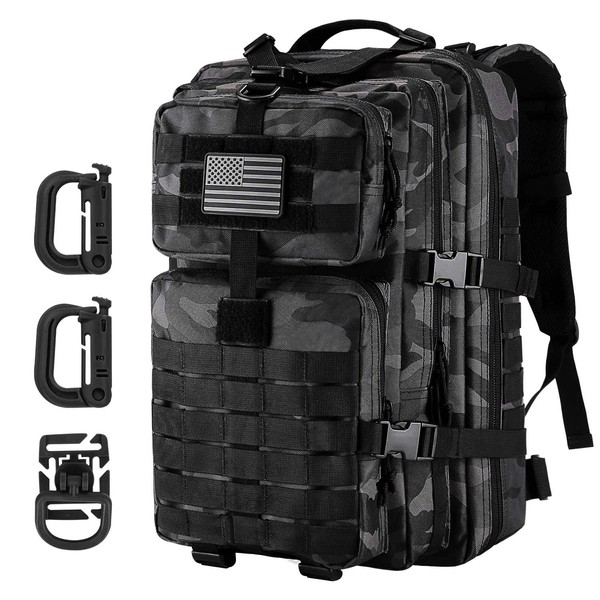 Hannibal Tactical 36L MOLLE Assault Backpack, Military Tactical Backpack Army Camping Rucksack, 3-Day Pack Trip w/USA Flag Patch, D-Rings, Black Camo