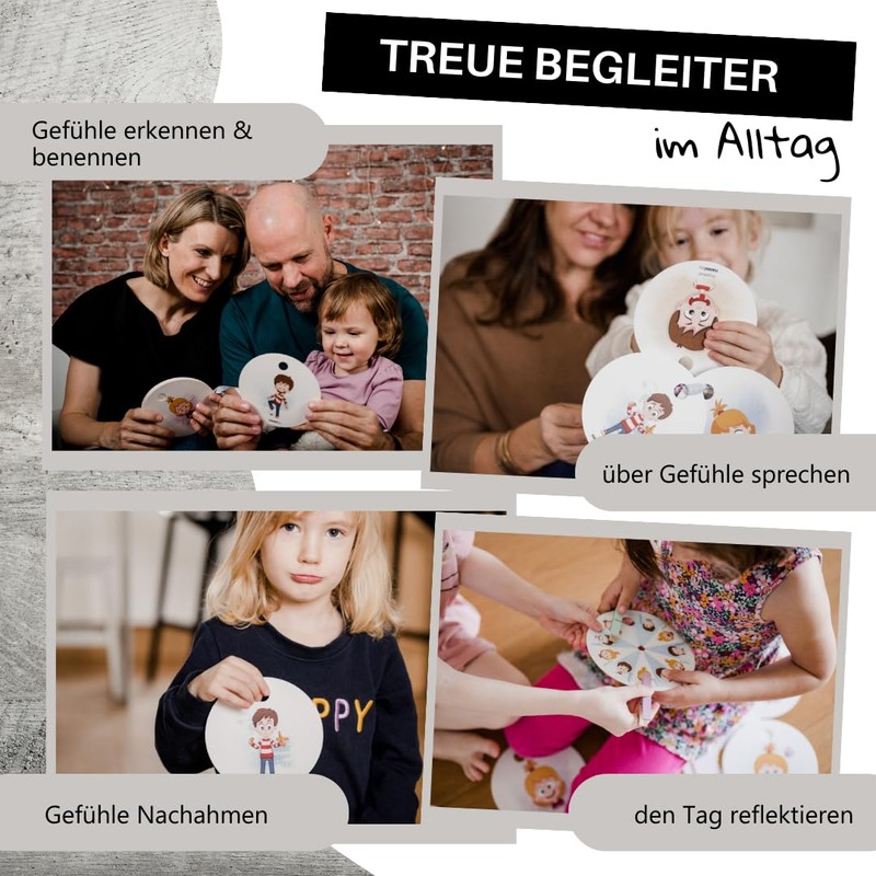 Emotions play a fundamental role in your child's development. They influence his thinking and behavior in everyday life. However, it is not an easy task to find your way around the complex world of emotions. Children who get explained feelings in everyday life without evaluating them can better deal with them, are more balanced and can respond better to challenges, frustration and defeats in life. These emotion cards support you and your child to immerse yourself in the world of feelings together in a playful way. There you meet Theo and his little sister Hanni, who experience different situations and reveal their feelings to you. As children can easily find themselves in stories, connecting points are created with the help of our cards to put their own feelings, feelings and needs into words and make them friends! Our cards show eight feelings: anger, fear, sadness, joy, disgust, surprise, shame and curiosity. We have supplemented this list with two states - boredom and relaxation - as these also occur in children's everyday life, - show a facial expression on the front and on the back a situation that triggered the feeling, - were designed with professional support of the developmental psychologists of PÄPSY, the educational - psychological centre in Vienna, - have a diameter of 14 cm. produced exclusively in the EU produproduMade from a thick cardboard, have been coated with a scratch-resistant film, can be taken anywhere and attached with the included practical loop.