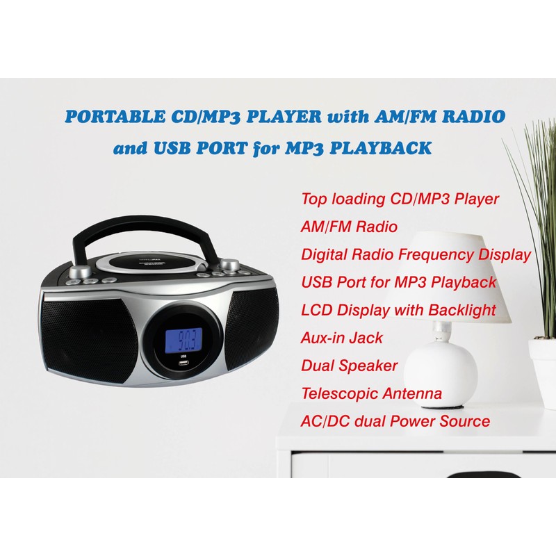 • Portable CD/MP3 Player and USB: Top Loading CD Player: Supporting CD/CDR/CDRW/MP3 with outstanding stereo sound quality. Also, play your favourite MP3 music on a USB flash drive through USB port.