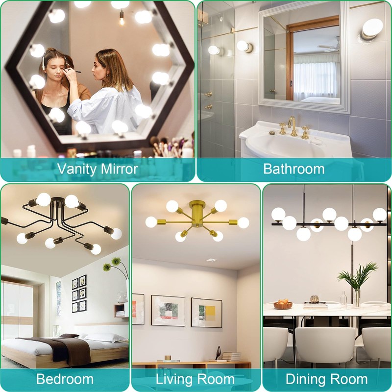 - Eye-friendly And Flicker-free: Enjoy the uniform light without any flicker, which is helpful to protect your eyesight since you may get close to the vanity mirror light when making up. What makes flicker-free so essential is that you can avoid unnecessary headaches and vertigo during using. A round light bulb with an E26 standard medium base is ideal for vanity mirrors, chandeliers, pendants, and wall sconce. Its also a great choice to be used in the bathroom, dressing room, kitchen.