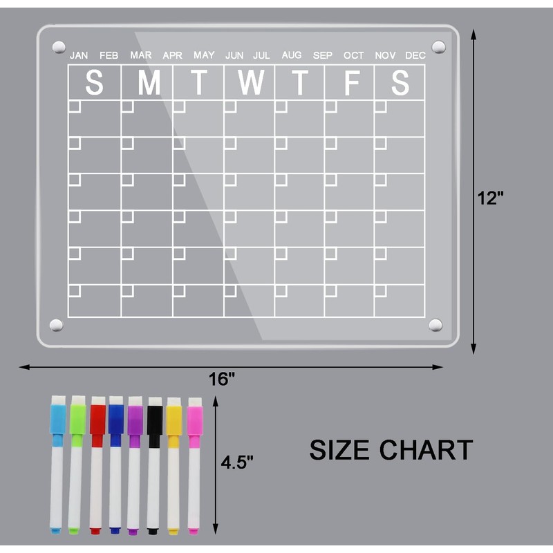 - ★★📅【Magnetic Dry Erase Calendar Board】: The magnetic calendar board for fridge is a ultra clear acrylic planning board for writing and designed to keep your daily life organized. The acrylic board can be attached to flat refrigerators or different metal surfaces. The calendar board measures 16"x12" inches which could save you space and well plan your family's daily life.