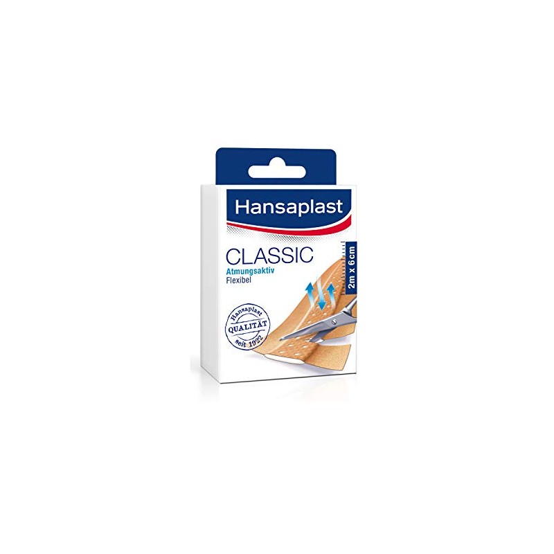Hansaplast Classic plasters are suitable for all types of minor wounds or injuries. The non-adhesive wound pad protects and cushions the wound. The durable material and the extra strong adhesive strength ensure that the plaster does not slip. The plasters are available in cuttable metre. Application: