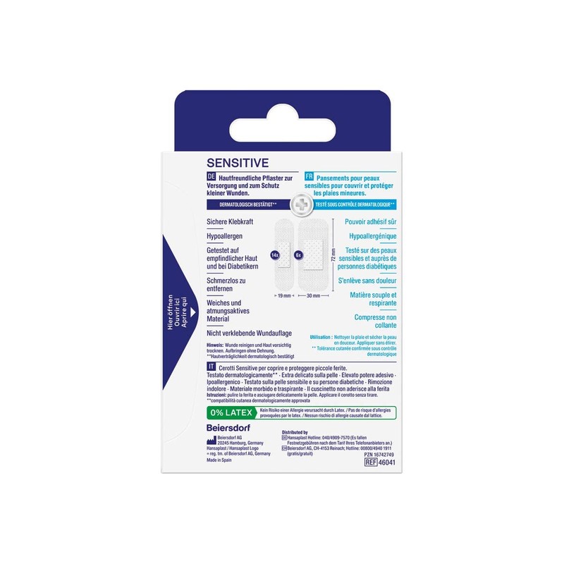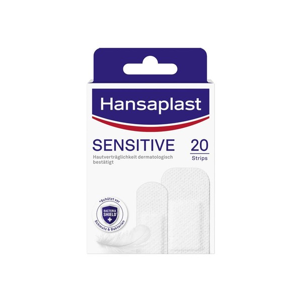 - Box contents and details: Hansaplast Sensitive plaster set with 20 plasters in 2 different sizes, skin-friendly and hypoallergenic