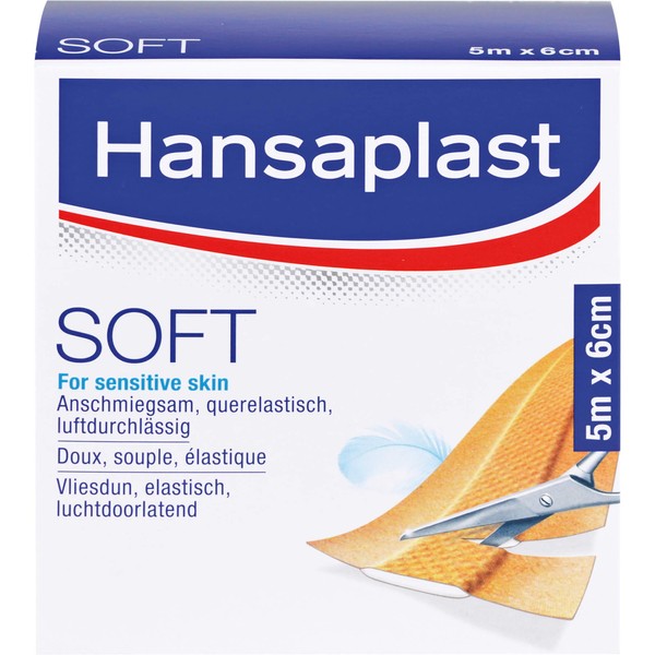 Hansaplast soft plasters 5 m x 6 cm roll (pack size: 1 piece) are particularly skin-friendly and compatible adhesive plasters for minor and medium injuries to the skin surface. Hansaplast soft plaster, 5 m x 6 cm roll (pack size: 1 piece) is particularly suitable for sensitive skin types.