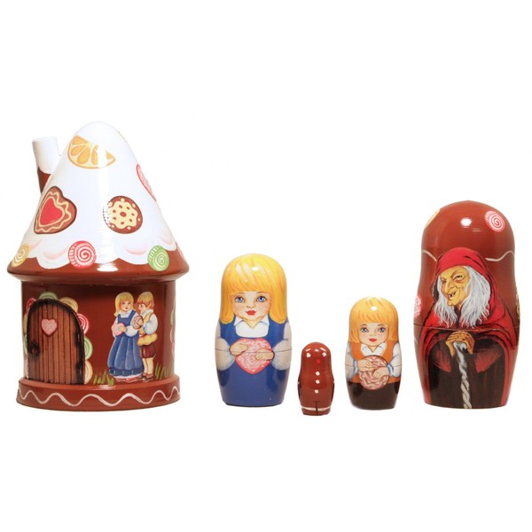 Hansel and Gretel is a classic German folk tale that has worked its way into American holiday traditions. And now it has worked its way onto a Russian nesting doll! The gingerbread house actually opens up as the first part of this nesting doll. From inside spring the hungry witch, the lost children Hansel and Gretel, and finally a gingerbread man that will soon be restored to life, once the witches spell is broken.