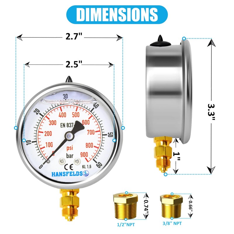 - Pressure gauge 0-60 bar/psi 63 mm dial