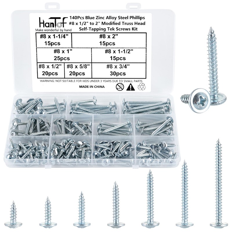 HanTof 140 Pcs Blue Wafer Head Wood Screws, #8 x 1/2 to 2 inch Modified Truss...