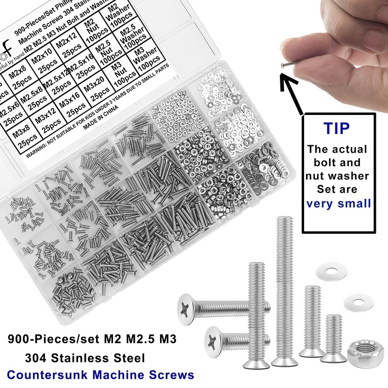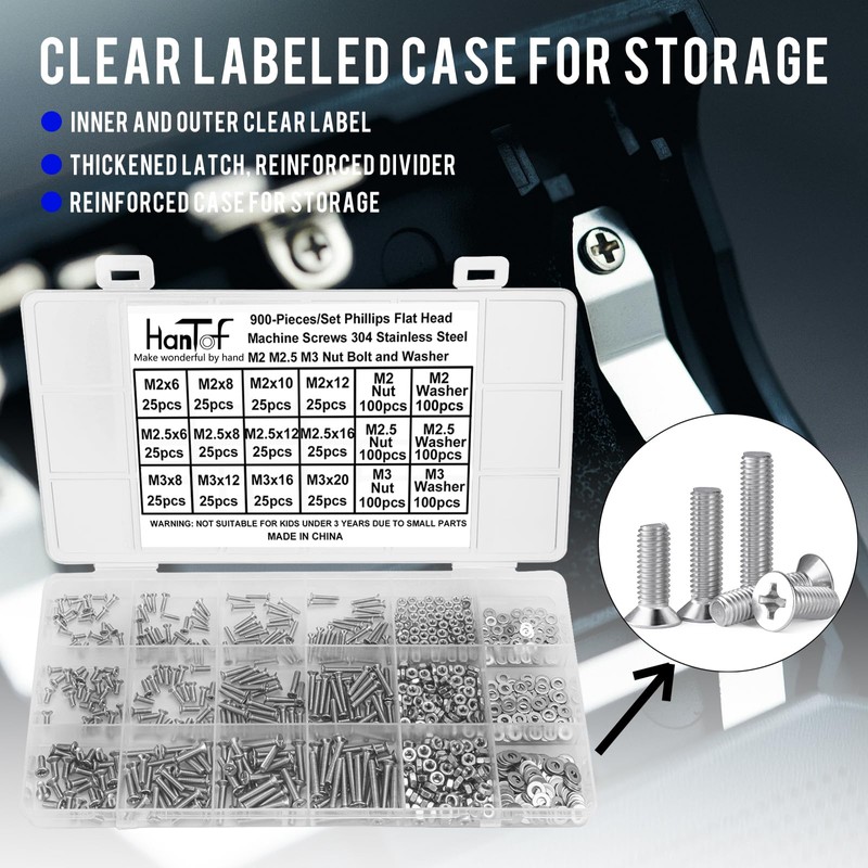 HanTof 900PCS Countersunk Head Screws Assortment Kit, M2 M2.5 M3 Bolts and Nuts Washers Set, Phillips Drive Flat Head Machine Screws, 304 Stainless Steel, Small Bolts Fully Threaded with Storage Box.