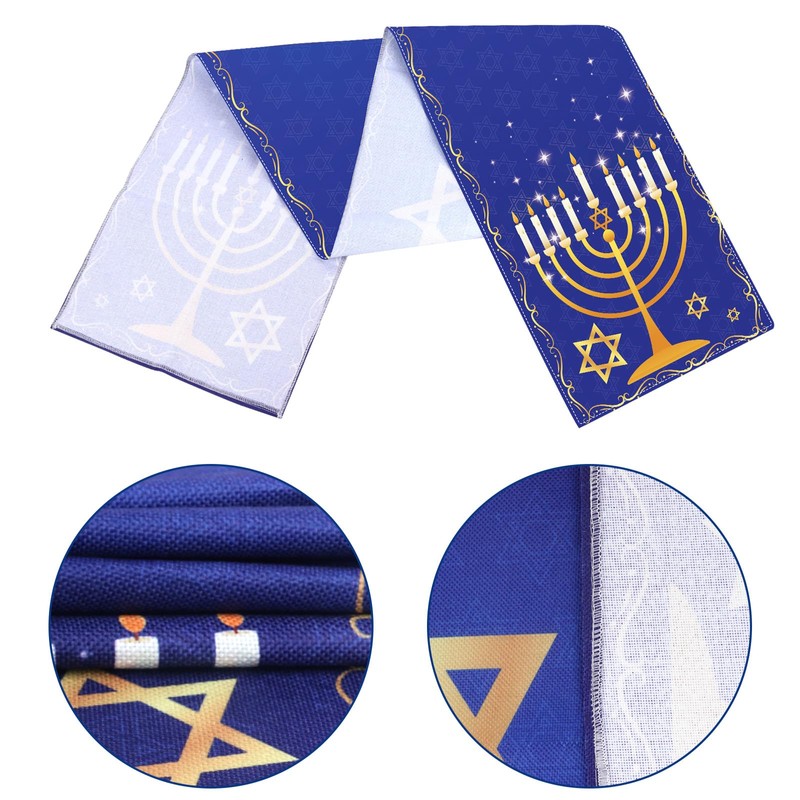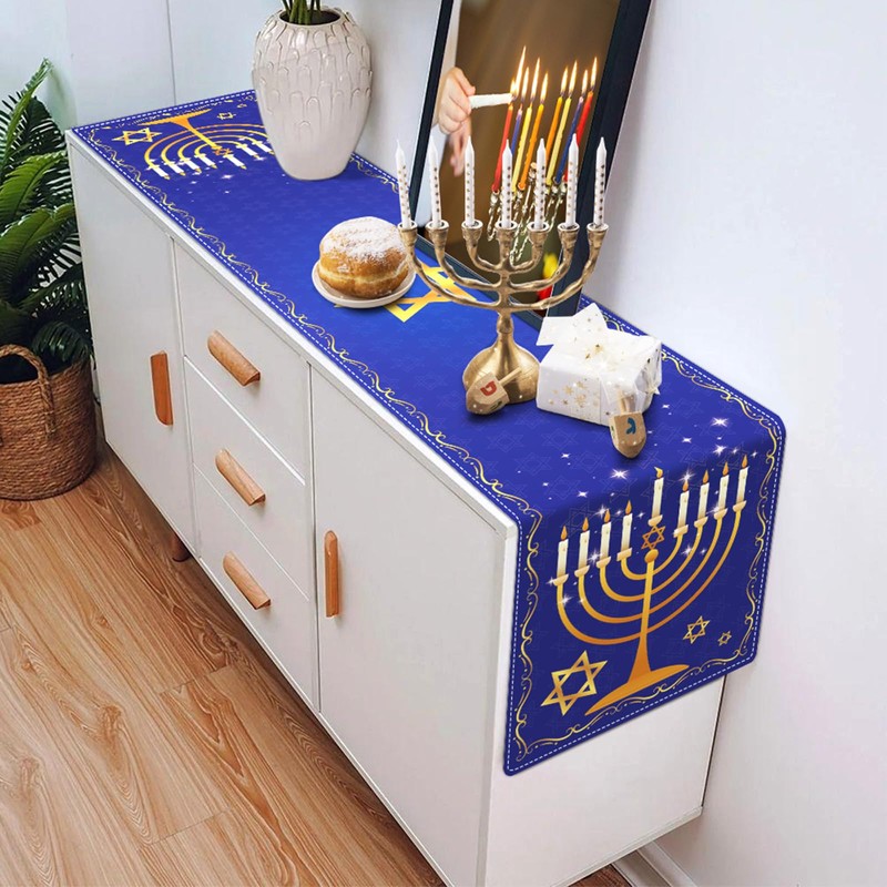 - HOME DECOR: Suitable for decorating sideboards, dining tables, TV tables, farmhouse tables, coffee tables, living rooms, dressers, and also for everyday use in Jewish kitchens and dining rooms. This Hanukkah style table runner is not only suitable for everyday dining, but also as Hanukkah party decorations, Hanukkah party decorations, Hanukkah party supplies and baby shower.
