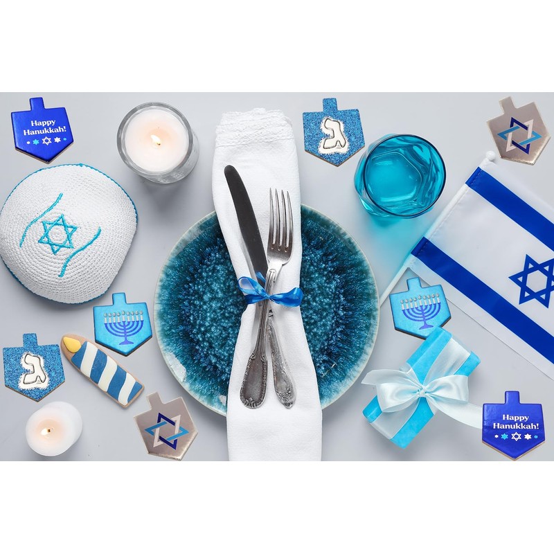 - These beautiful Hanukkah Table Decorations with Large Glitter Dreidels and Stars in blue and silver will create a beautiful runner down the center of your Table! A great start if you are looking for Hanukkah Decorating Ideas.