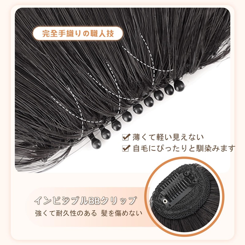 - [No discomfort. Natural texture]: Looks and feels like natural hair. In addition, it comes with a clip to increase the friction, so you can rest assured that it will not slide off even if it gets blown in the wind. Everyday Hair Color: 4 natural colors close to your natural hair. And because it is made of human hair, you can dye it freely in your home color. Hand planted: The hair is planted by hand, so it has a fluffy finish and is not impressed by the wig