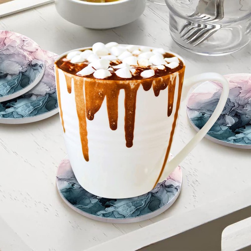HAOCOO Coasters Stylish Ceramic Marble Pattern Cork Back Round Set of 4 Mugs Tea Pads Insulation Better Than Diatomaceous Earth, Water Absorbent, Quick Drying, Anti-Slip, For Home and Office, Housewarming Gift - SRMK10 (Pink Blue)