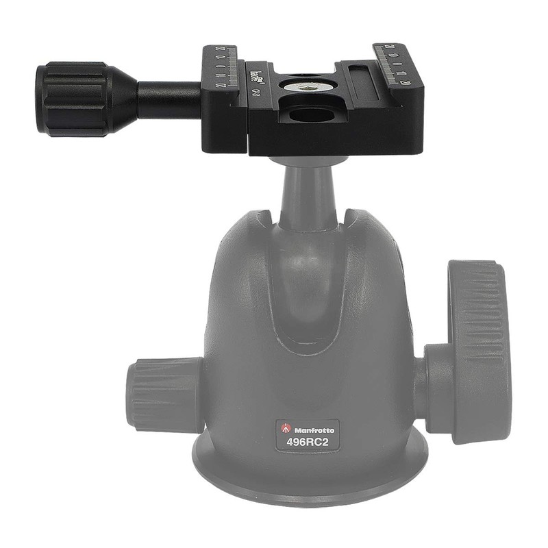 - Arca Swiss compatible quick release clamp. The Boss Adapter has a ridge on one side which fits in the groove on the underside of the quick release clamp, and a ridge on the other side which fits in the groove on the Manfrotto ball head.
