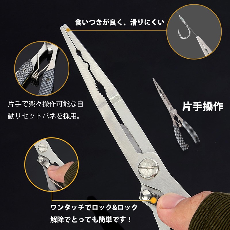 - 4. [One-touch lock and unlock safety] Fishing pliers have a locking function. When in use, the width is about 3.9 inches (10 cm) and the width is approximately 2.0 inches (5 Easy to lock and unlock with one touch. No more worry about scratching Uses an automatic reset spring that can be easily operated with one hand