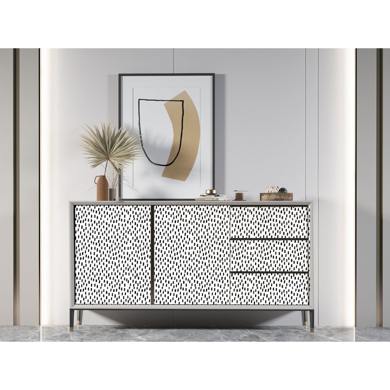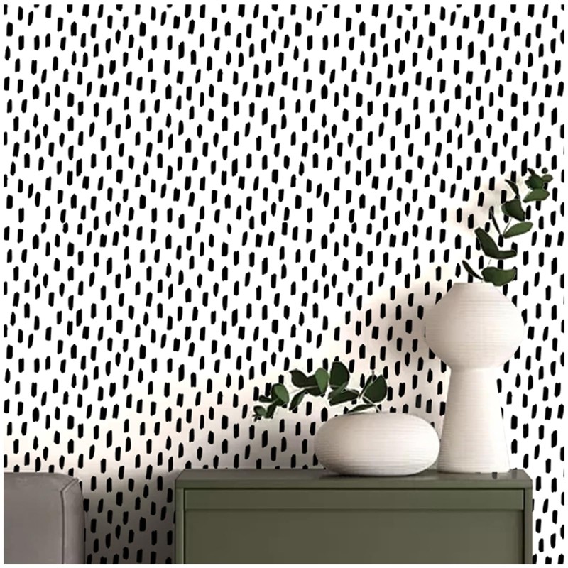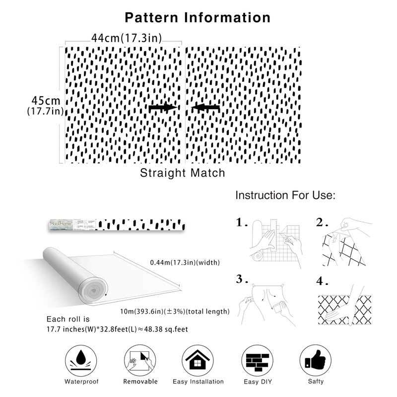 - PATTERN & DESIGN: Pattern repeat is H17.7" x W17.3" (H45cm x W44cm), straight match. Firstly to find the correct pattern repeat and then just directly match without overlap, it's very easy for beginner who never did peel and stick wallpaper before. This peel and stick wallpaper featuring a modern design of irregular small dots and stripes. The black background with white patterns creates a simple yet stylish look. Ideal for adding a modern and classical touch to any space.