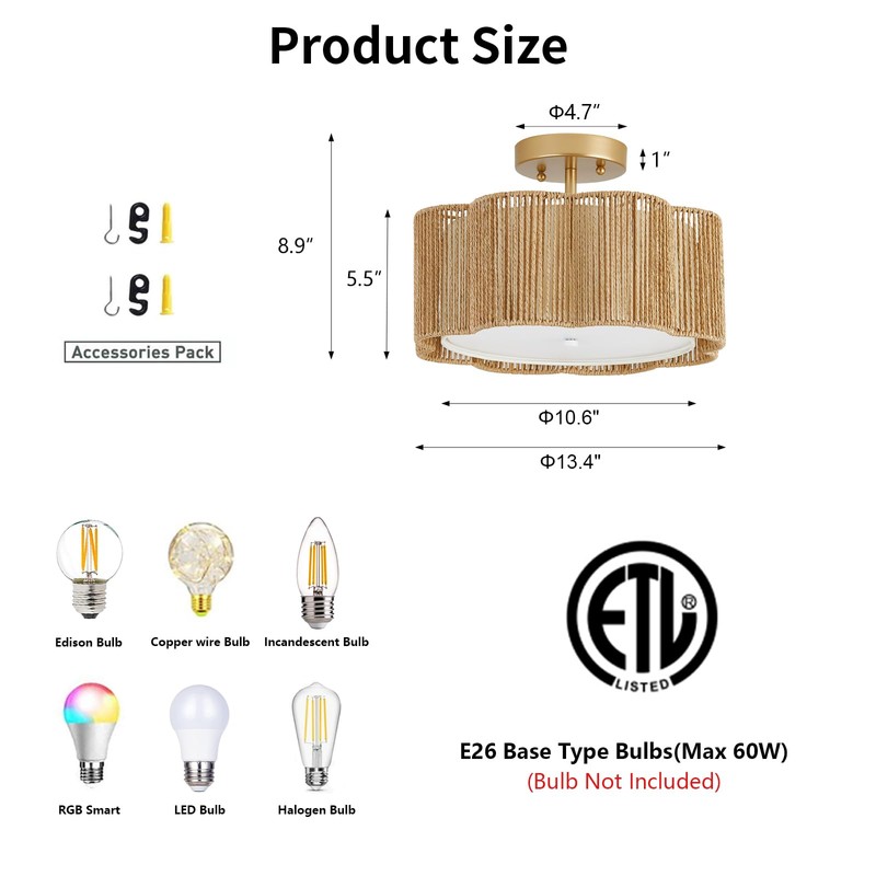 • 【Bulb Specifications】:Rattan Ceiling Light size 13x8.9 inch,compatible with all types of 2xE26 incandescent/LED bulb( Not Included).