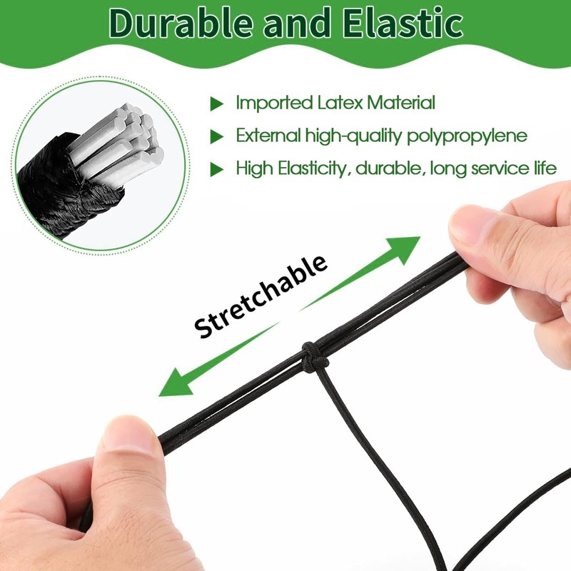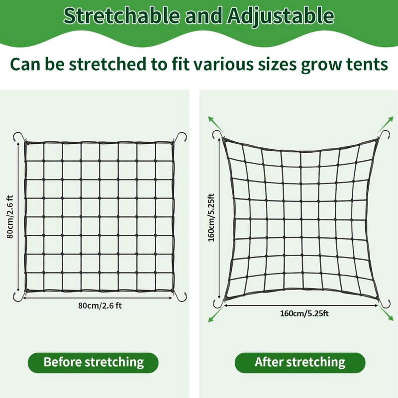 The elastic rope has a diameter of 3 mm, the plant net measures 80 x 80 cm/2.62 ft x 2.62 ft and can be stretched to 160 cm x 160 cm/5.25 ft x 5.25 ft, suitable for different sizes of grow tents or folded for smaller grow tents.