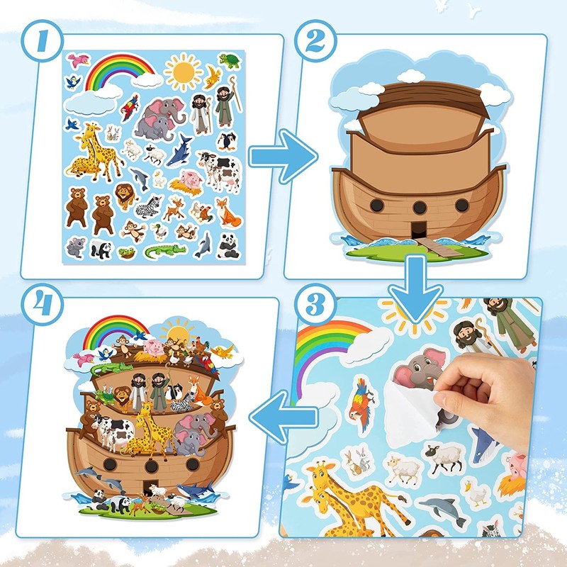 - Noah's Ark Sticker Kit: Contains 12 sets of Noah's Ark animal sticker scene, including 12sheets Noah's Ark backgrounds and 12sheets animal stickers for DIY, this is the ideal collection for teachers and parents to share and learn together with their children.