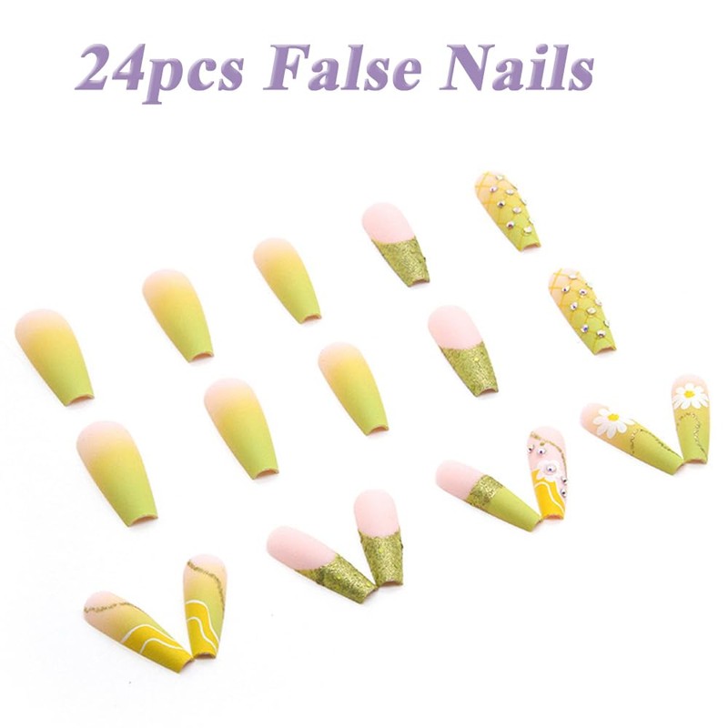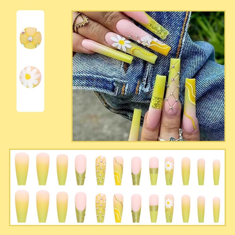 HaoTrade 24Pcs Long False Nails with Glue Stickers, French Full Cover Acrylic Nails Press on Nails Daisy Pattern Disassembled and Reused Stick on Nails for Women and Girls Nail Art (Gradient Yellow)