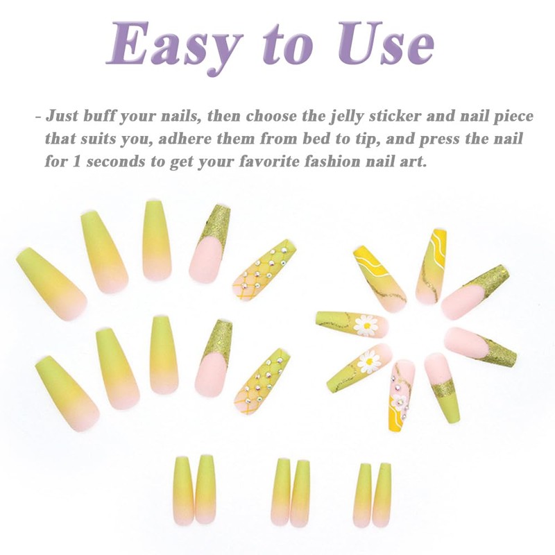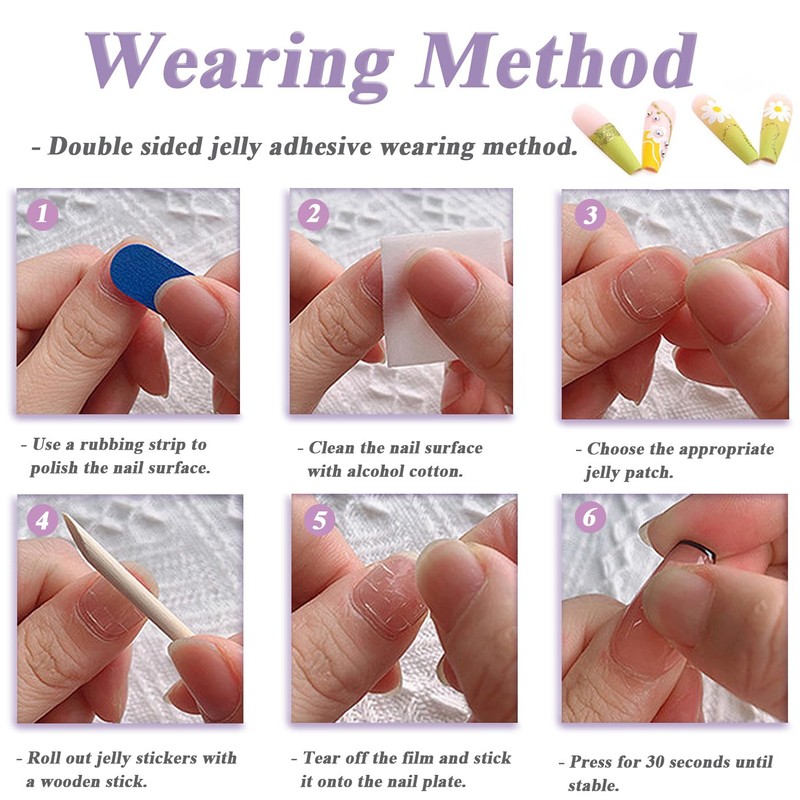 - Easy to Use: With just a few simple steps, you can have a nail salon like effect. First, you just need to use a nail file to polish your nails and clean any dust on them. Then, choose the appropriate size, apply glue or jelly glue, and press against the nails for 30 seconds to obtain a natural nail.
