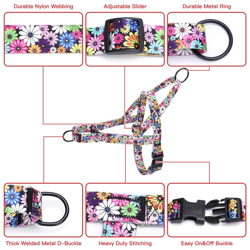 - 🐶【Stylish and Secure】 Featuring a beautiful floral pattern, our harness not only looks great but also provides the utmost safety for your dog. Made from durable nylon, it is built to withstand daily wear and tear.