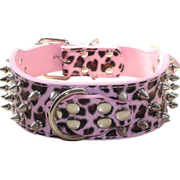 haoyueer Spiked Leather Dog Collar Bullet Rivets Studded 2 Inch Width Stylish Leather Dog Collars for Medium & Large Dogs Pitbull(Pink Leopard,L)
