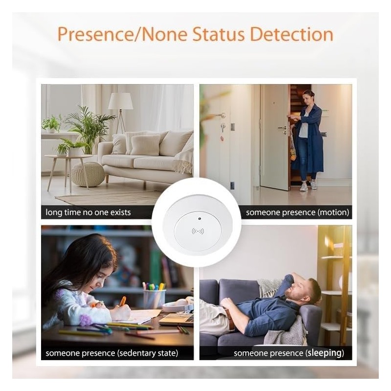 - Smart human presence sensor with light control: The Zigbee Presence Sensor can detect both human movement and stillness. In addition, the product can be directly connected to the light, so that the light is on when there is someone and off when there is no one, so as to achieve better energy saving effect.
