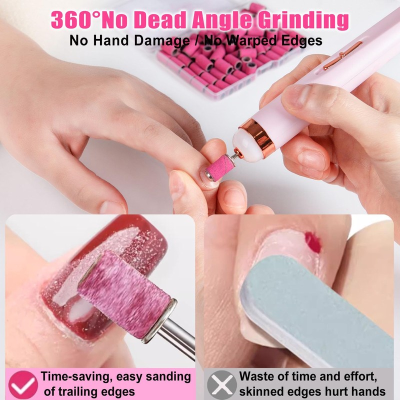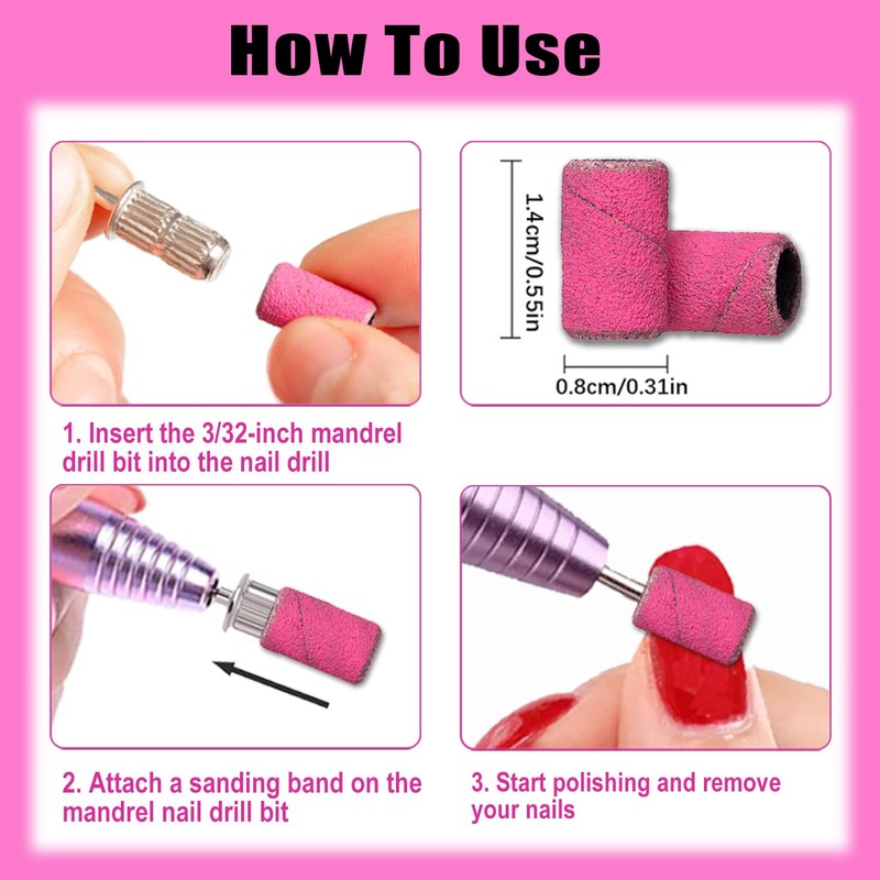 - ✅ MULTI-FUNCTIONAL SANDING BANDS -- Designed to fit most 3/32" nail drills, these bands expertly handle: Grinding, smoothing, shaping, shortening & polishing nails, Cuticle detailing & acrylic powder removal,Quick gel polish removal.Works with: Nail art kits, cuticle bits, and standard drill bits.