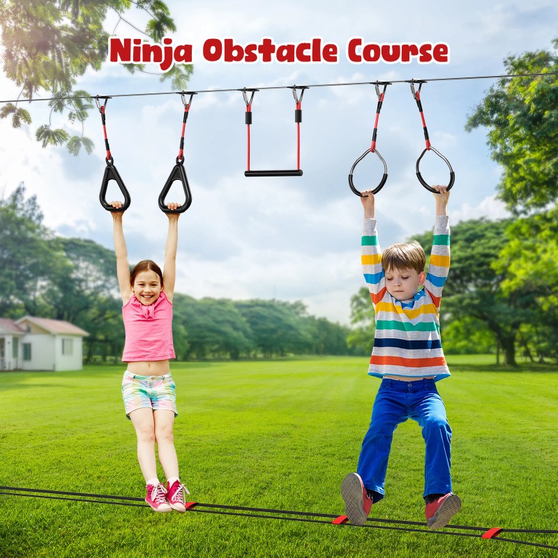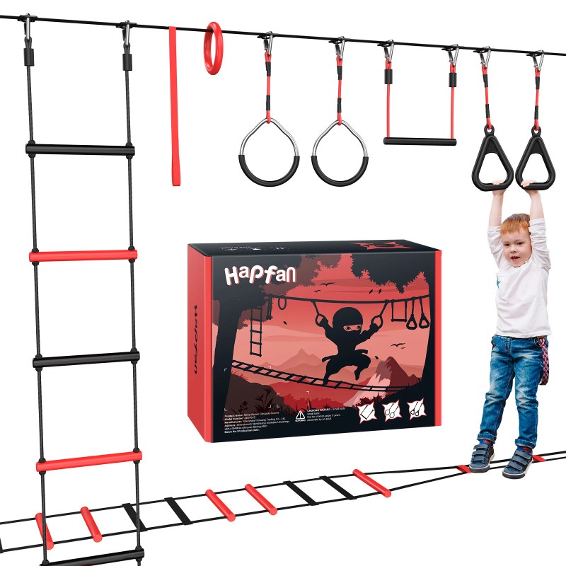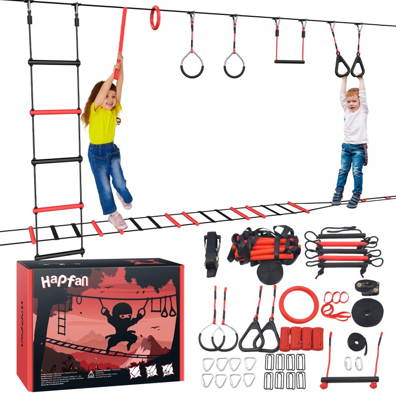 Hapfan 50ft Obstacle Warrior Course for Kids Slackline Monkey Bars w/ Suspension Bridge