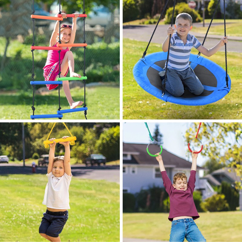 💪MOST COMPLETE OBSTACLES FOR KIDS TO CONQUER -Our kit has an exciting assortment of the most complete and fun obstacles. Kids LOVE it, and even forget about electronics (sometimes)! 5 Stairs rope ladder and Double Line Design make it much easier for little ones to climb to the obstacles line or swing on it, and keep your kid balance and safe.