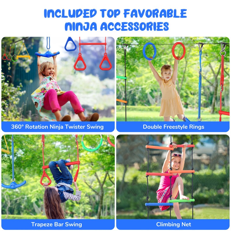 💪BECOME A REAL NINJA - Our ninja training course are specially designed for kids over 4 years old. Upper Line can be installed more than 11 obstacles, and Ground Line can be used as a training line to improve strength and balance. Get your kids OUTSIDE and Overcome obstacles course of different difficulty in the most fun ways. Warriors never afraid of difficulties!