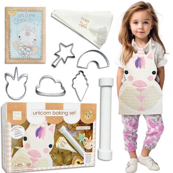 The Hapinest Make and Bake Set comes with 5 unicorn themed cookie cutters, 1 unicorn children's apron, 1 Hapinest Roller, 1 recipe book, 2 stainless steel frosting tips, 2 plastic frosting couplers, and 2 reusable frosting bags. Girls will love baking and decorating with these unicorn themed cookie cutters, which include a unicorn, rainbow, cloud, ice cream cone, and magic wand. The Hapinest roller is uniquely designed to roll your cookie dough to just the right thickness with every batch. Kids will love the ease of use as they develop their baking skills. The unicorn apron is made of polyester, corduroy, and felt. Features quilted pockets and ties at the back. Fits kids sizes 4 to 8. Machine washable. Give the gift of hands on learning and creativity. Girls ages 4 years old and up will enjoy this unicorn themed baking kit, perfect for birthday parties or any day to connect with mom and dad in the kitchen.Product Description
