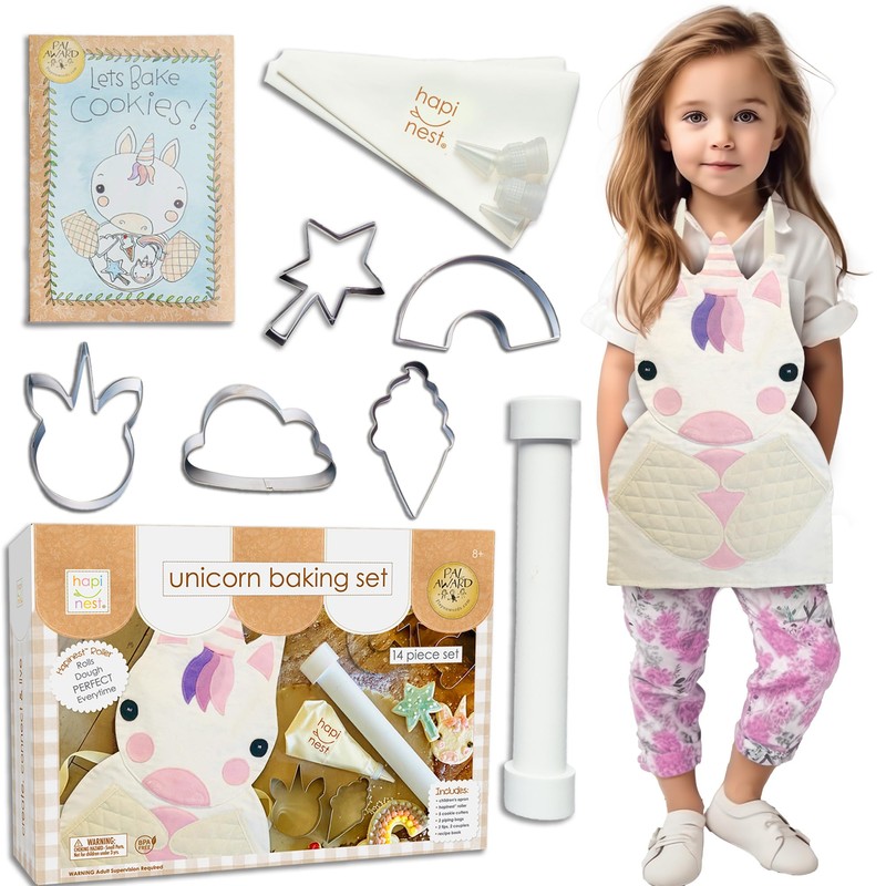 - The Hapinest Make and Bake Set comes with 5 unicorn themed cookie cutters, 1 unicorn children's apron, 1 Hapinest Roller, 1 recipe book, 2 stainless steel frosting tips, 2 plastic frosting couplers, and 2 reusable frosting bags.