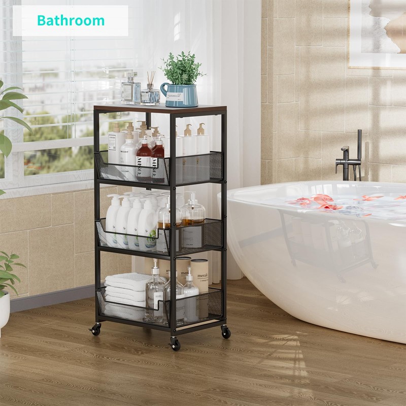 - [Tilted Baskets for Easy Access]: The tilted basket design on this kitchen storage cart allows for quick and easy access to your stored items. Whether it's fruits, vegetables, or other essentials, the angled baskets ensure that your fruit and vegetable storage cart is both convenient and stylish for everyday use